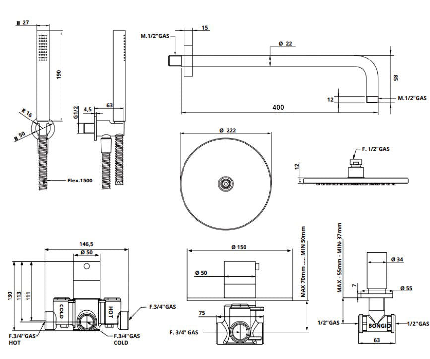 Bongio Squadra set inbouw thermostaatkraan incl. twee inbouw stopkranen hoofddouche 22,2cm, douchearm 35cm en handdoucheset, mat zwart