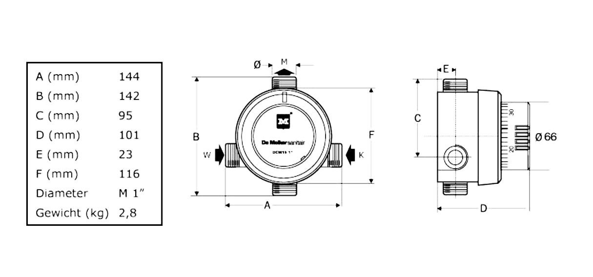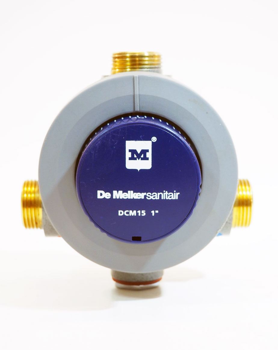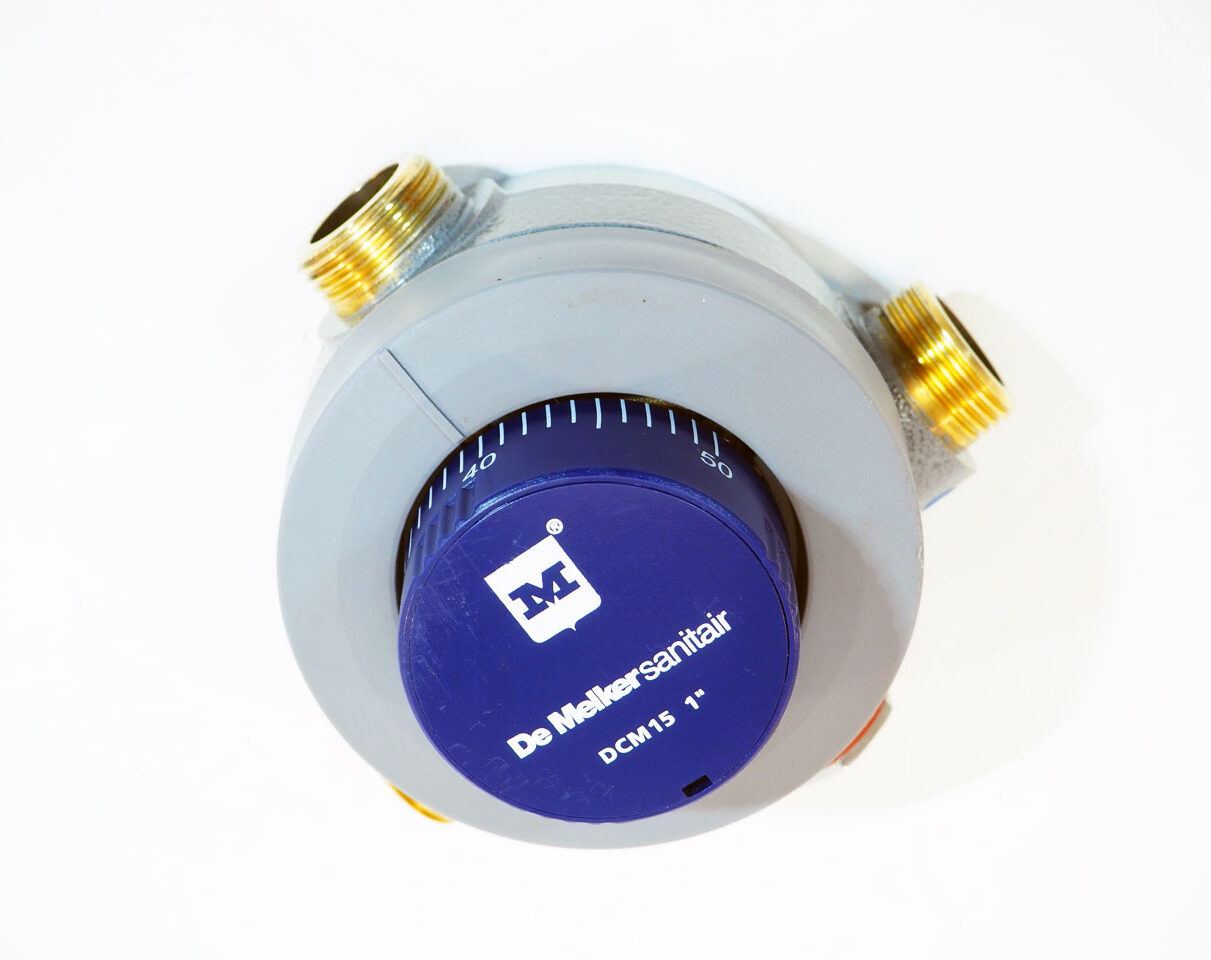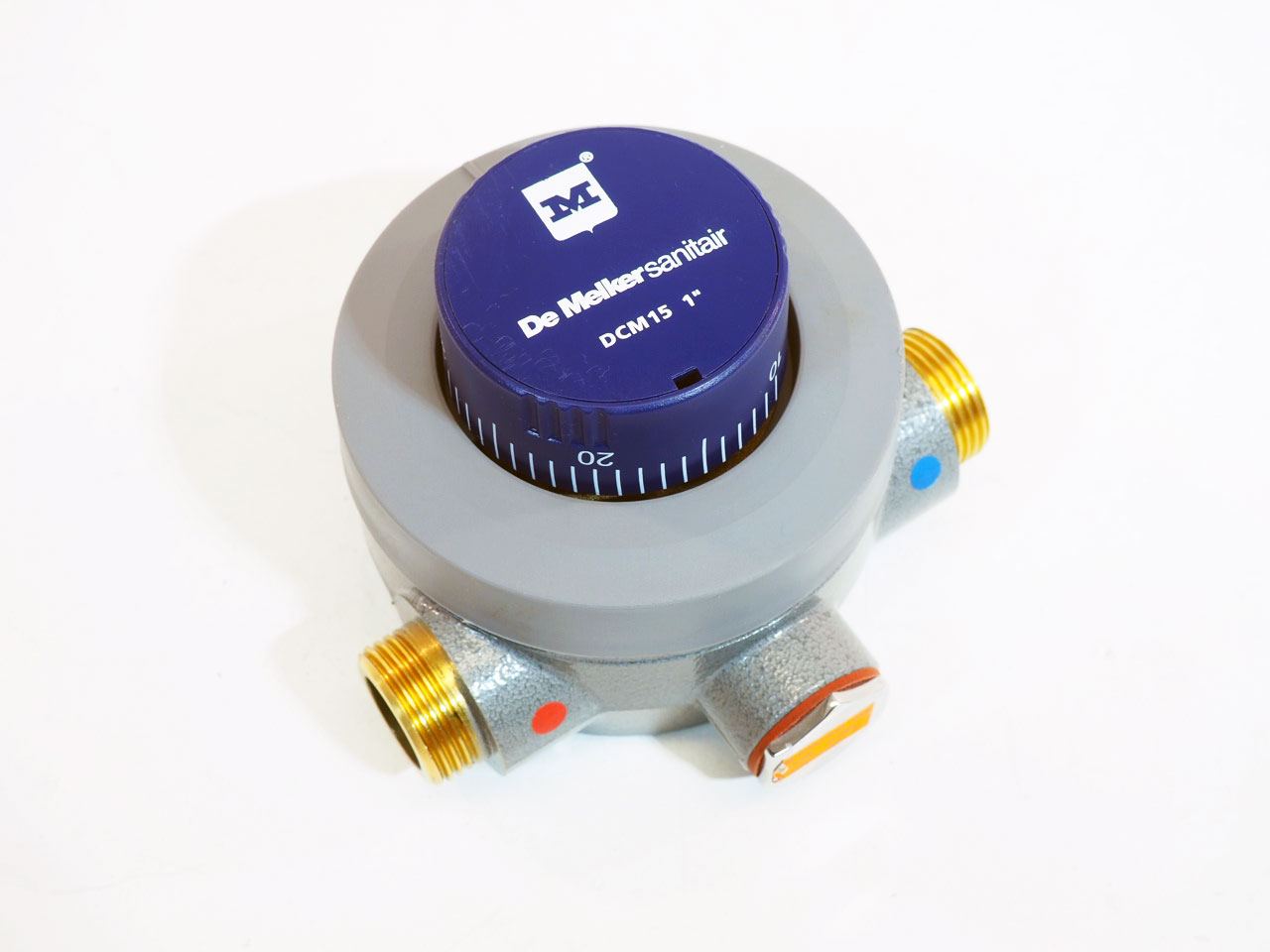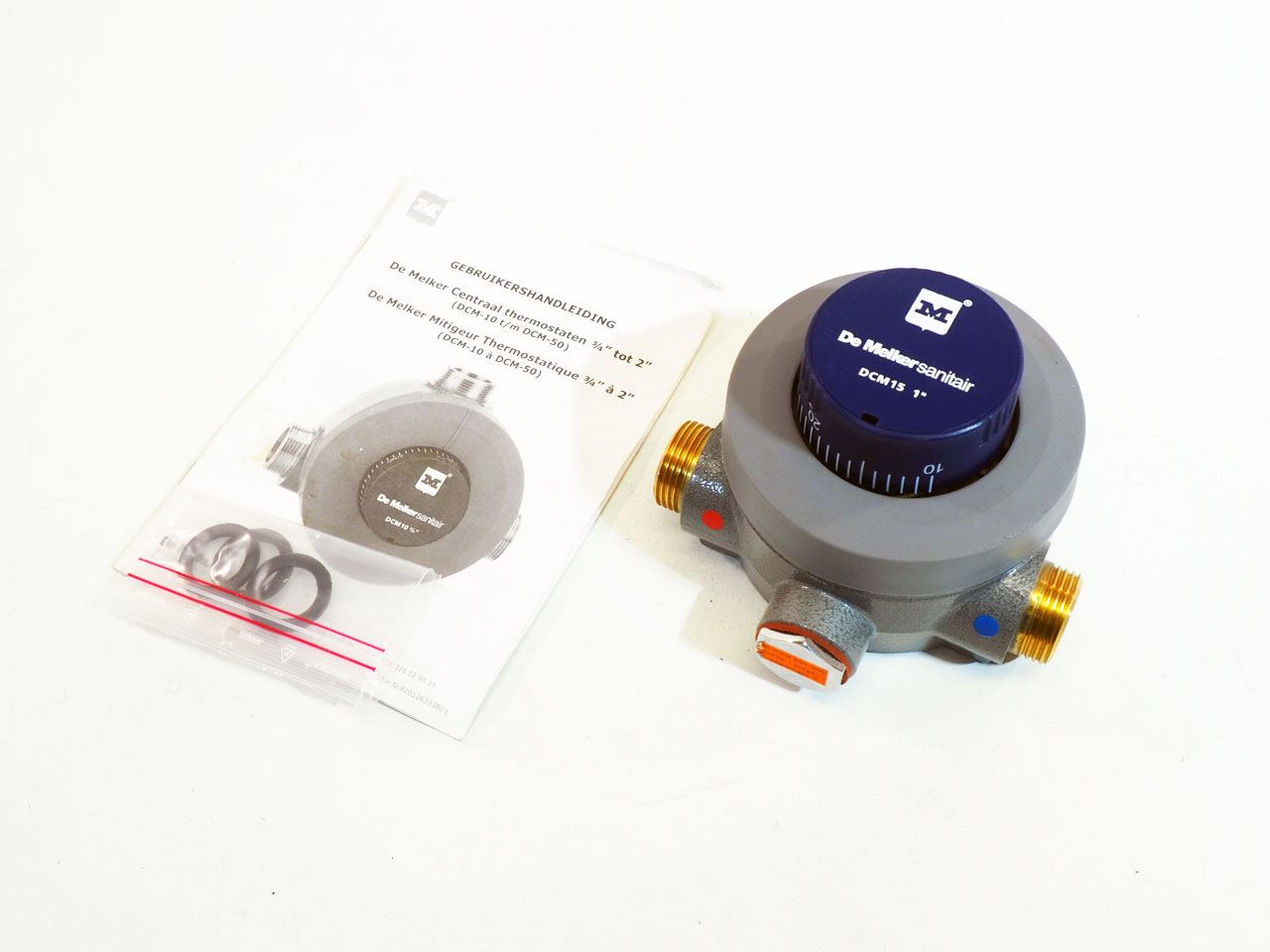 Omschrijving: De Melker thermostatisch mengventiel, type DCM-15. Voorzien van thermostatisch patroon, maximum mengtemperatuurbegrenzing, temperatuurblokkering waarmee de gewenste mengtemperatuur gefixeerd kan worden en ingebouwde gecertificeerde keerkleppen. Inlaten en uitlaat 1" buitendraad. Capaciteit 15 tappunten. Bij gebruik van zelfsluitende systemen 19 tappunten. (Uitgaande van 6 l/min per tappunt). Temperatuur instelbereik van 10°C tot 50°C. Minimale afname voor een optimale mengregeling: 3 l/min.
