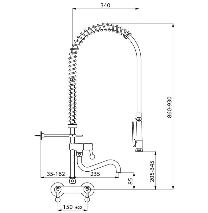 Wand, muurmodel uitvoering met vaatdouche en uitloop, uitvoering uitloop draaibaar boven, 2-gats kraangaten, met standpijp, maat aansluiting aanvoer 1/2