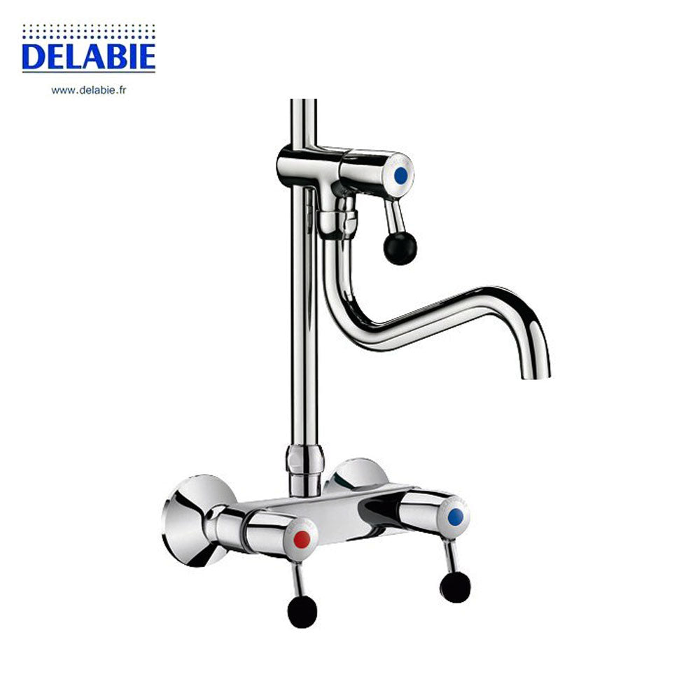 Delabie grootkeukenmengkraan wandmontage voorsprong uitloop 235mm, uitvoering met vaatdouche en uitloop chroom