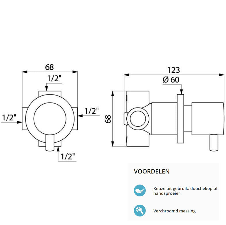 Ingebouwde omsteller laat toe te kiezen tussen de vaste douchekop en de handdouche