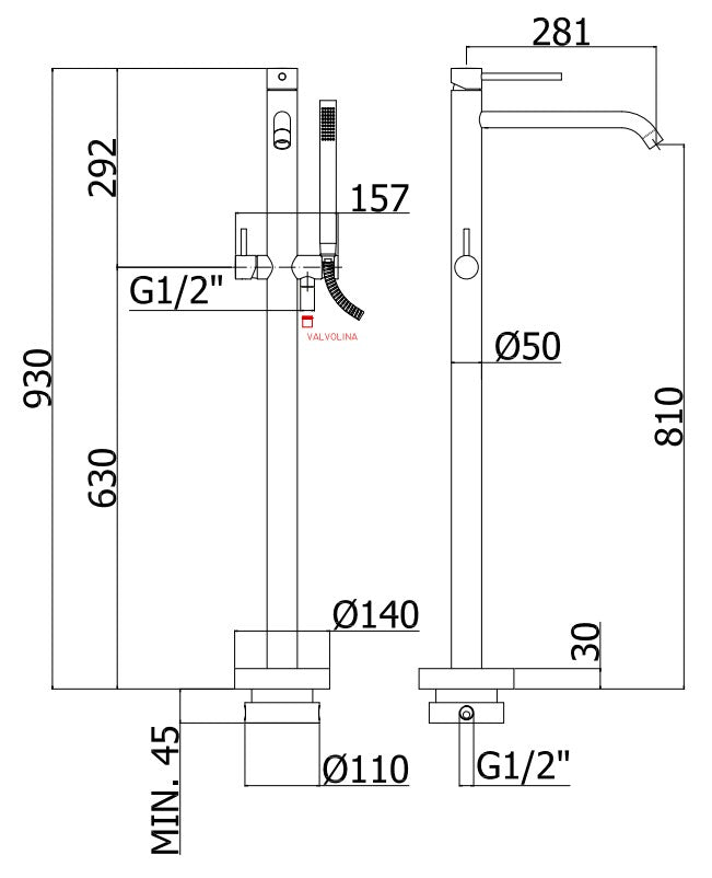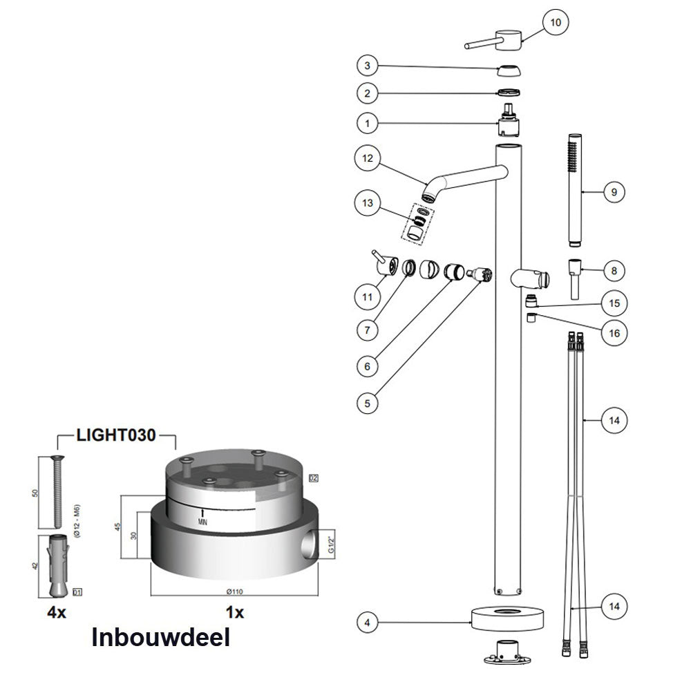 Bestaat uit: Vrijstaande badmengkraan en inbouwgedeelte, basisgarnituur voor vrijstaande badkraan